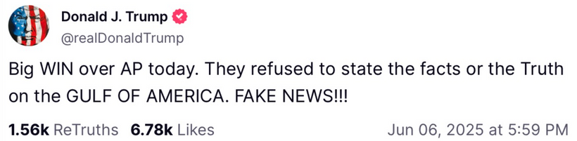 (54:46) TWEET Trump complaining that the AP refused to start calling it “Gulf of America”