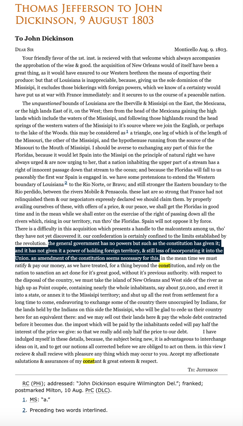 (1:03:45) PIC Thomas Jefferson quote from letter to John Dickinson August 9, 1803 “a constitutional amendment seems necessary for this.” https://founders.archives.gov/documents/Jefferson/01-41-02-0127