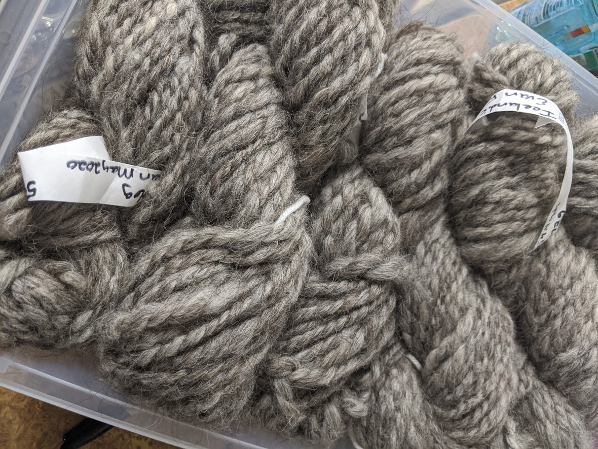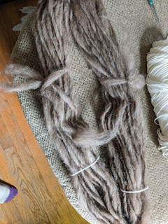 Michelle finished spinning Evan's (moorit gray Icelandic fleece). Some of it needs to be dyed to be made into a teddy bear for her daughter.