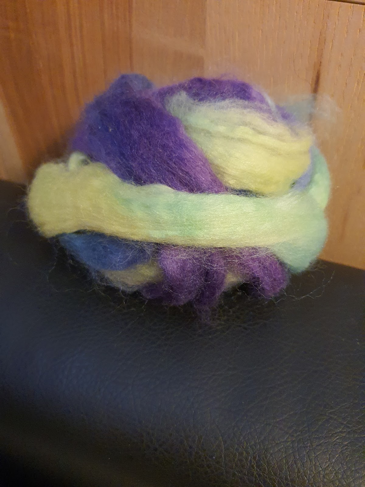 Erica was actually fortunate that Ply Away was cancelled this year. Erica generally is unable to attend Ply Away without taking a significant amount of time off work, hopefully it will fall over Spring Break one year! Due to the unfortunate cancellation of the event, she was able to purchase several One of a Kind colorways from Fiber Optic Yarns. The first one she chose to spin was the below Wensleyday, her first longwool spin for her 51 Yarns study. The staple length was about 8". Erica saw first hand that longwools do not need much twist at all before they become a bit ropey. She is going to study up and practice a bit more, before spinning the purple one of a kind colorway she also ordered in Wensleydale. It has been a lot of fun to have some new fibers to spin and become familiar with, especially since Erica has actually traveled to the actual town of Wensleydale. :)