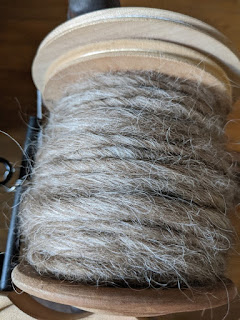 Michelle started spinning another Icelandic fleece. This time she's trying to make a Lopi style yarn by spinning it bulky without lots of twist. She's then putting it back through the wheel as if to ply, but leaving it a single. This takes some of the twist back out. This leaves a very squishy, airy single.