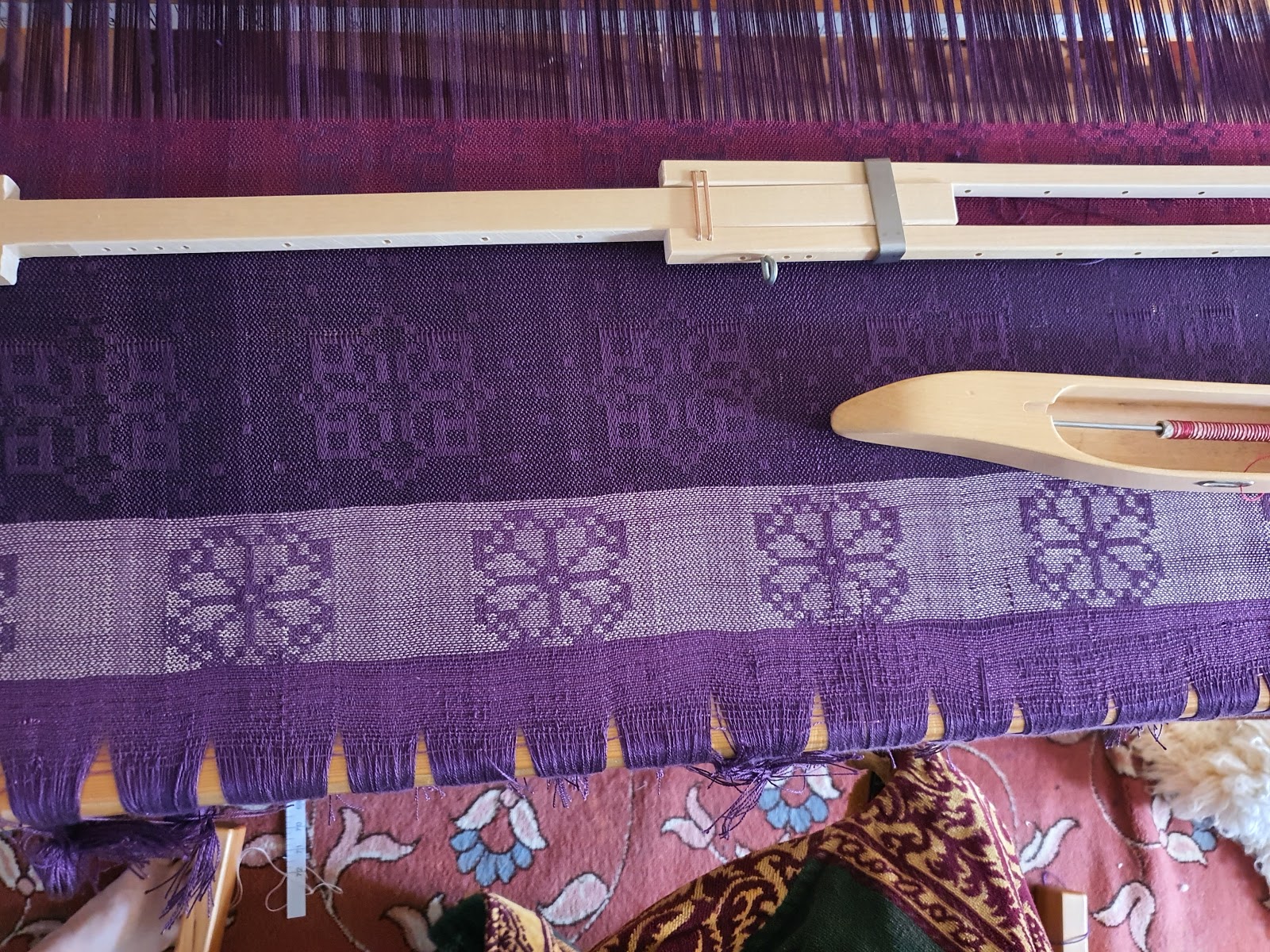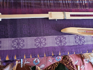 Erica is glad to be back at her damask weaving, she has resleighed the reed and is again sampling different color weft and refining her design.