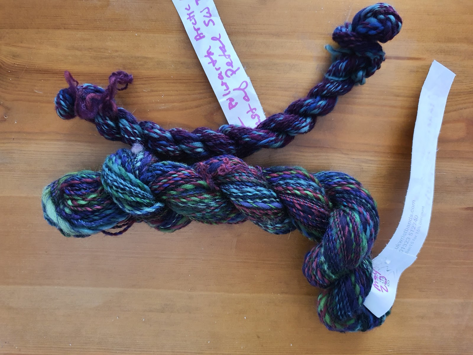 Erica has finished spinning her Finn Breed and Colour Study yarns. She finished off by spinning up the batts she created with the Artic Berries colorway, from Crafty Jaks, the larger skein in the image below left. She combo plied some of what was left with another colorway grapevine, which is primarily very dark purple and green. She also combo plied the Lakeside colorway, also from Crafty Jaks with the colorway riproaring. Listeners may remember this color way from the beginning of the podcast and Erica's color management study.