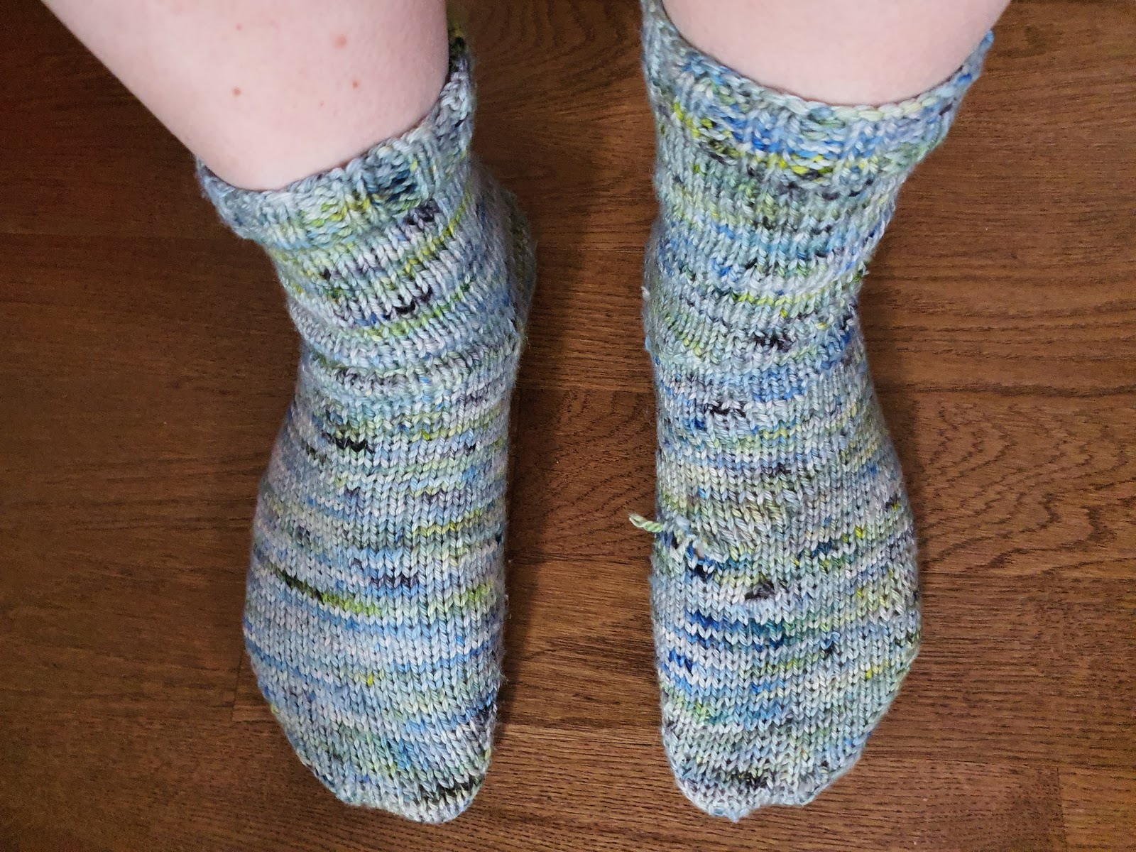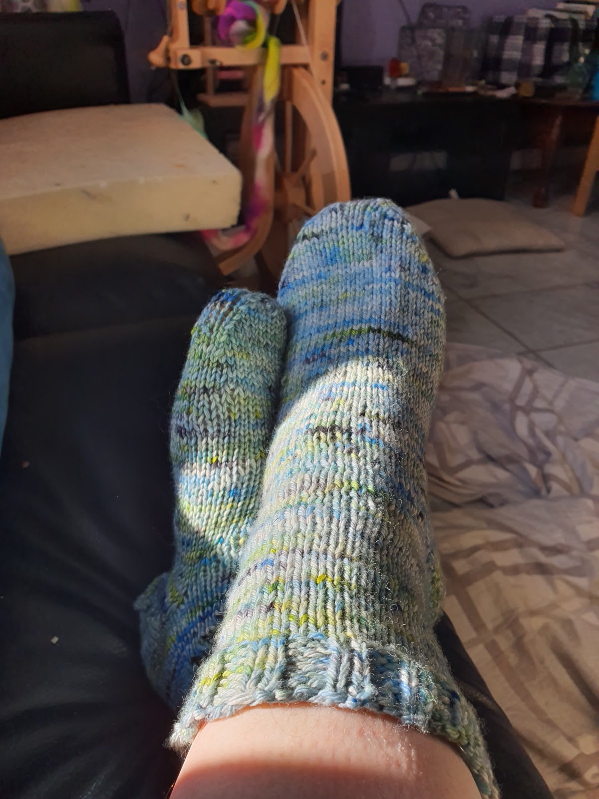 Erica's pair of socks is officially done, she now has 2 socks in this lovely worsted weight yarn! She is sad to see BluPrint is closing. She learned how to knit on Bluprint and still relies on it to learn how to knit new things. She is now a confident sock knitter. The first photo is the unaltered photo, you can see ends of one knot sticking out and if you look closely can see the swirl of end of needle stitches. The second photo is the glamour shot. :)