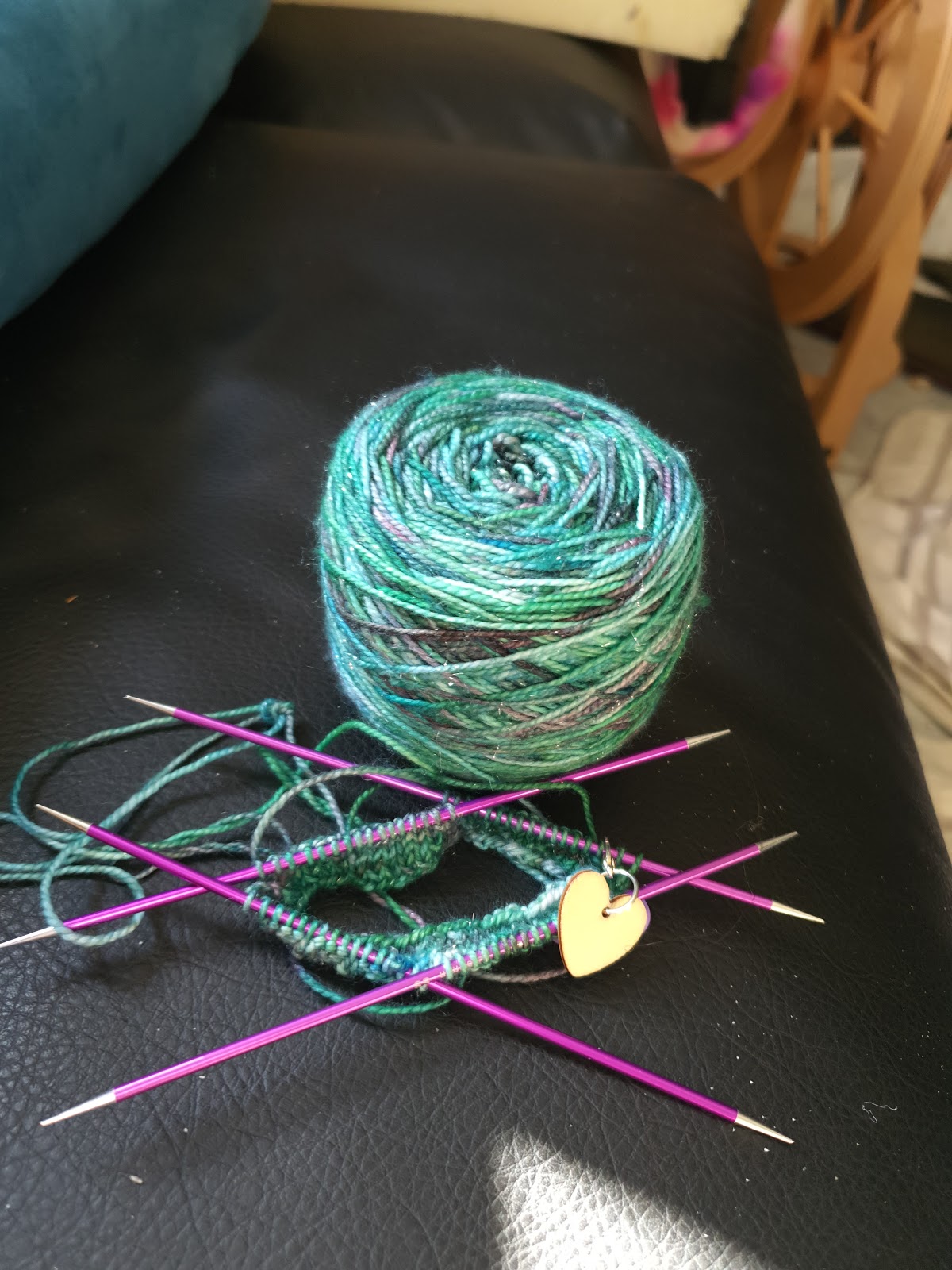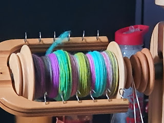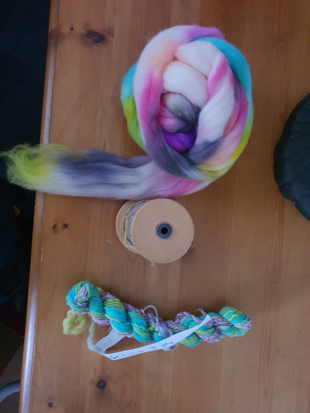 Erica has spun one single in this gorgeous Rambouillet. This is colourway is called Gizmo, for all children of the 80's. and is from Fiber Nest Studio. Rambouillet is related to Merino, but the wool is much more like Targhee, very spongy and sproingy. Below is a prepped half of the braid, the top of the bobbin, because I was not thinking, and the three-ply sample I made from the last bit that was not quite a full repeat of the colourway. Below is the first single still on the bobbin.