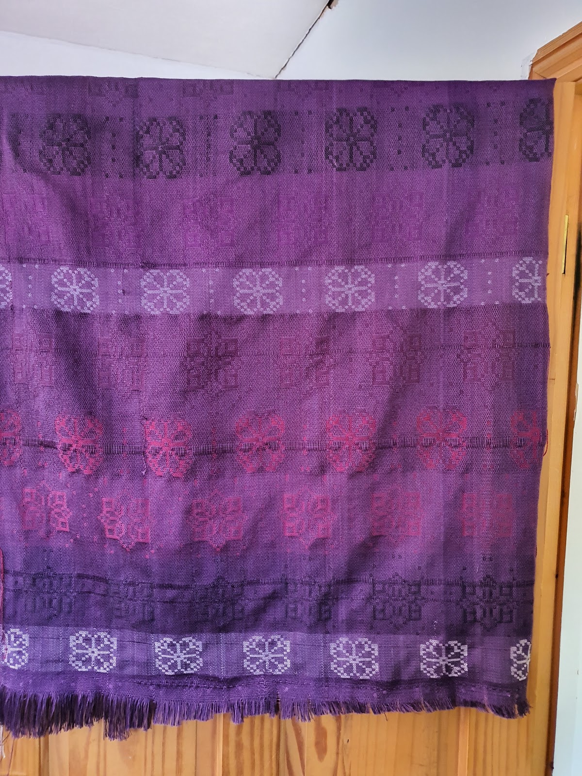 Here is Erica's beautiful damask sample. The black (top), the next light purple (third from top) and the red wefts are all Gemstone silks from Halcyon Yarn. All these colors are out of stock at the moment, some colors are currently in stock, if you are looking to buy some lovely silk yarn. Gemstone silk is great for weaving as warp for normal things. Erica would not recommend it for warp on a drawloom, where you need very high tension! It is a great yarn for all other uses. She has some new silk weft to try from Treenway Silks, more on that in future episodes.