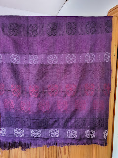 Finished objects. Previously, Michelle talked about how her daughter was weaving a rug. Her younger daughter also wants to weave one, but all we had left was white rug yarn. So we dyed it. It's red, fuschia and purple. Works in Progress: Michelle did some spinning. This was roving dyed back in her Washtenaw Wool dyeing days.