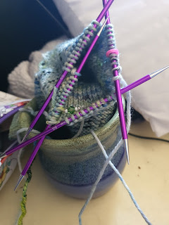 Below is the well-loved cup Erica has started using, instead of a yarn bowl. She does not have yarn bowl, but has wanted one for years. This cup still sparks joy, but is not quite functional as a cup anymore. So she is using it as a yarn cup, and loving it in this capacity, photo with her second sock, but now being used for TJ's second sock.
