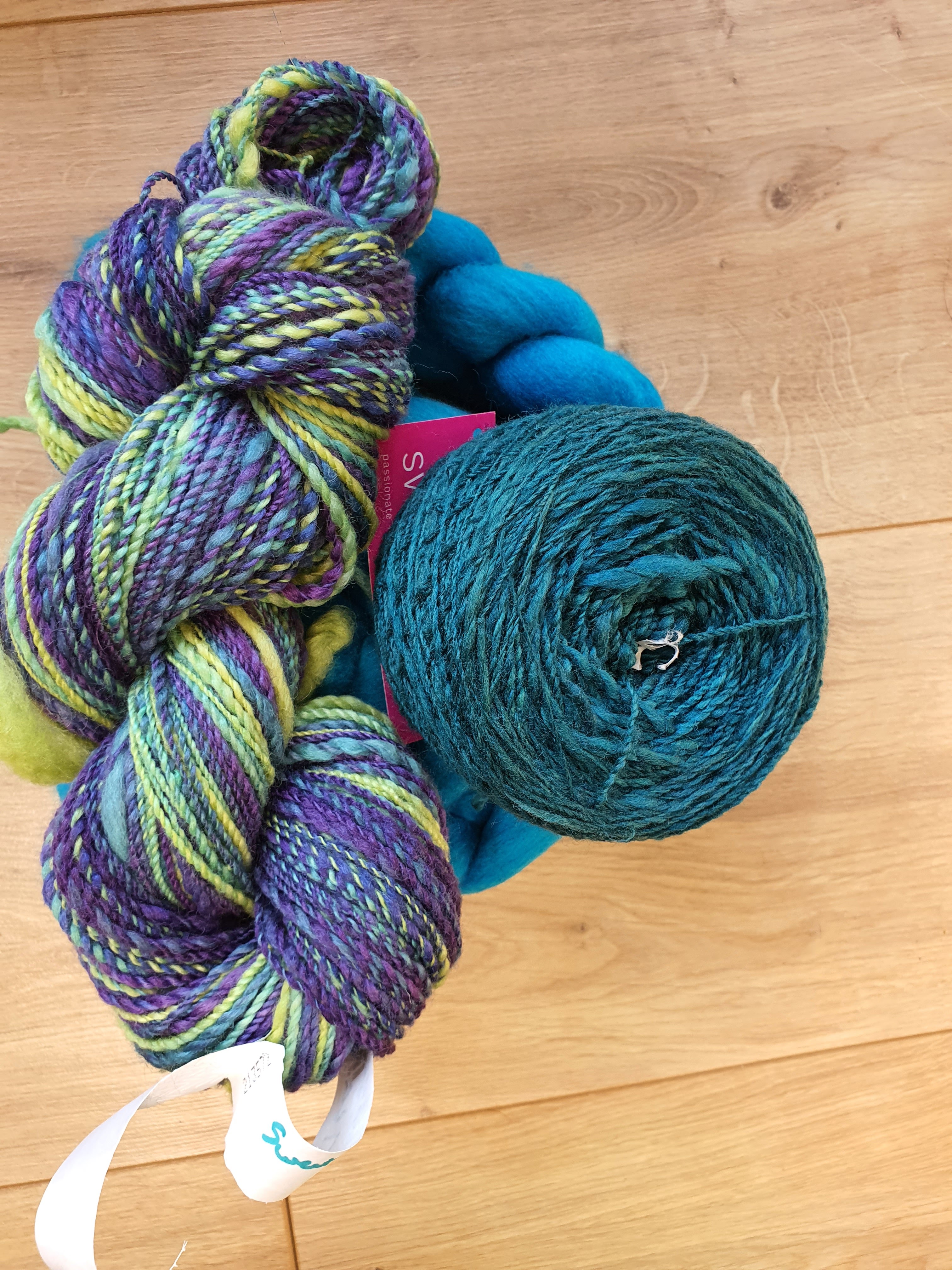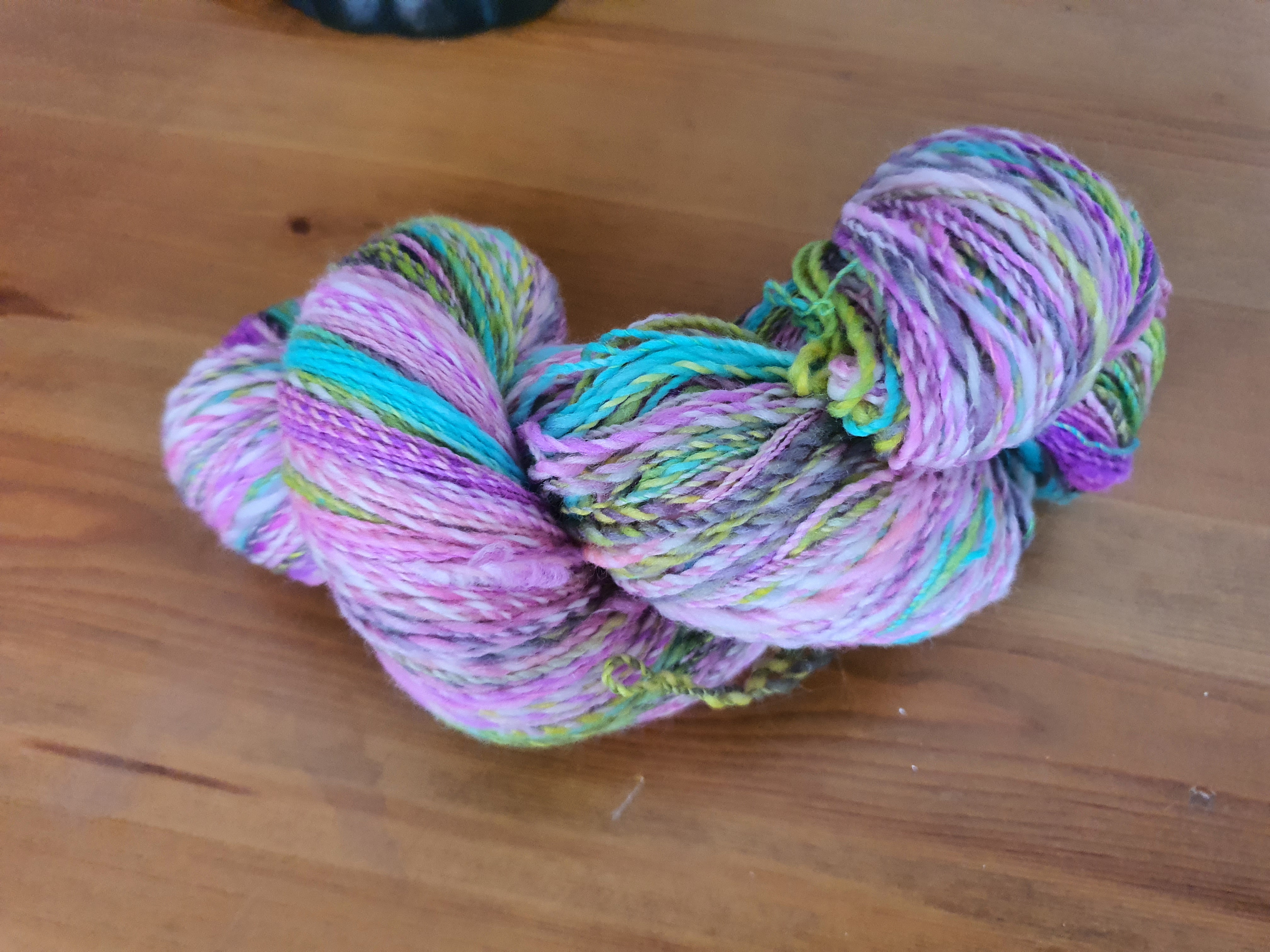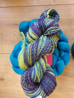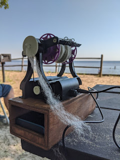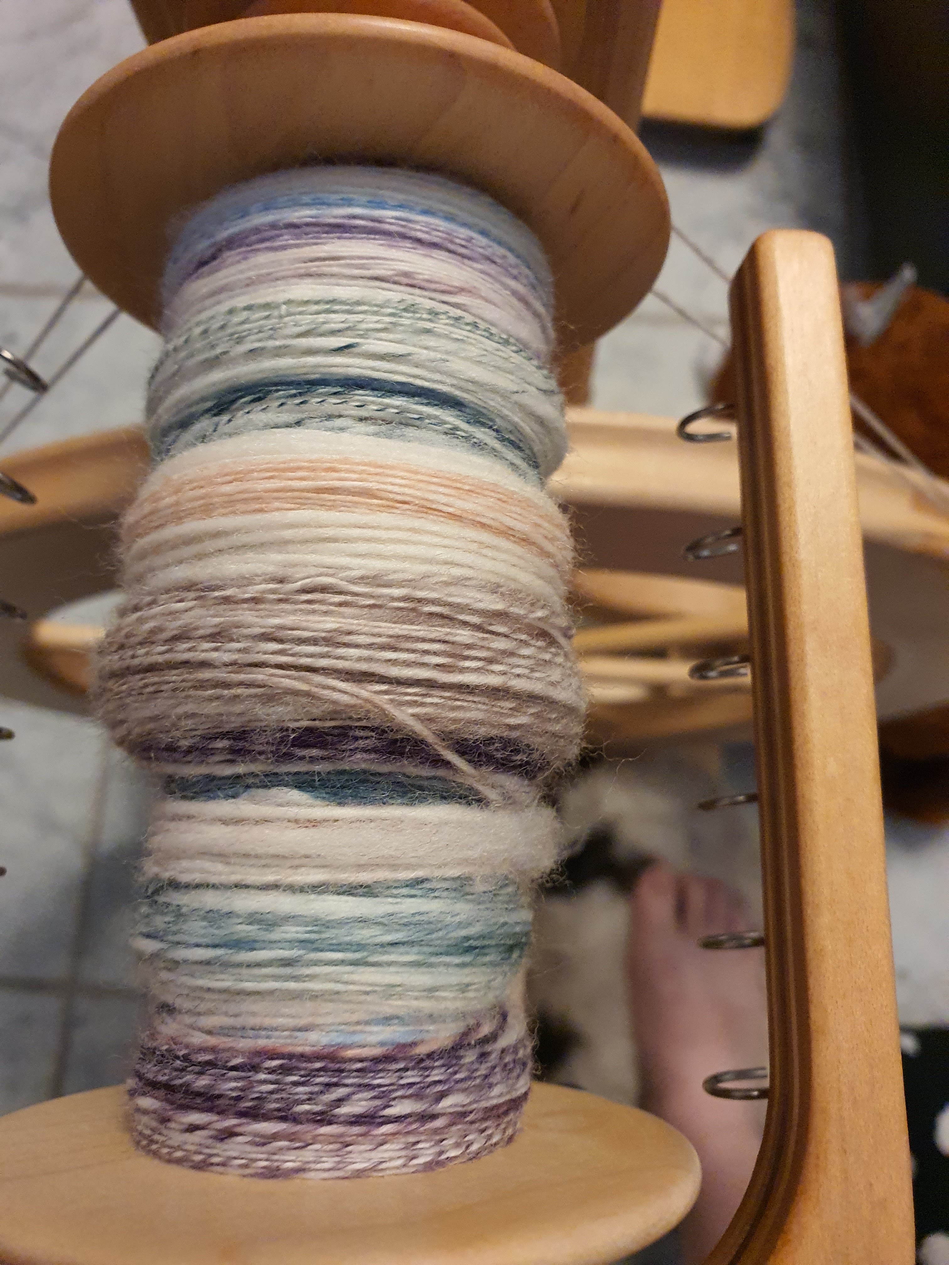 Michelle and her Dad built a box to hook her Electric Eel Mini spinning wheel on. It has a space below for her battery and screws in the top to hold the wheel. She's very pleased with how it came out. She spent more time attempting to spin on the Mini and finally figured it out in the end. She needed to find the balance for where to place a brake band. Too tight and it slows the wheel quite a bit. Not tight enough and it won't pull in. She had her doubts about the wheel during the first two bobbins, but was able to figure it out in the end and was able to spin 4 more bobbing relatively quickly and easily. It will be nice for travel, but won't replace her home wheel.