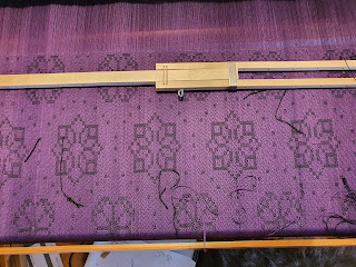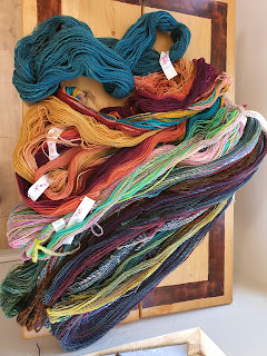 Finished objects. Previously, Michelle talked about how her daughter was weaving a rug. Her younger daughter also wants to weave one, but all we had left was white rug yarn. So we dyed it. It's red, fuschia and purple. Works in Progress: Michelle did some spinning. This was roving dyed back in her Washtenaw Wool dyeing days.