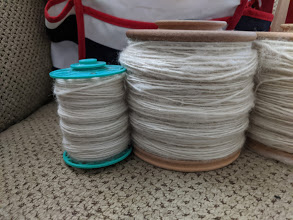 Tour de Fleece! Michelle has started spinning the Coopworth/Shropshire cross fleece that she carded. Some was spun on the Electric Eel mini spinning wheel (bobbin on the left) and some on her Ashford Traveler with the jumbo flyer (bobbin on the right). Erica thought the difference between the two bobbins amusing for some reason.
