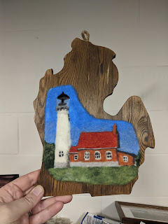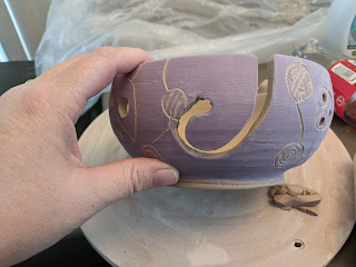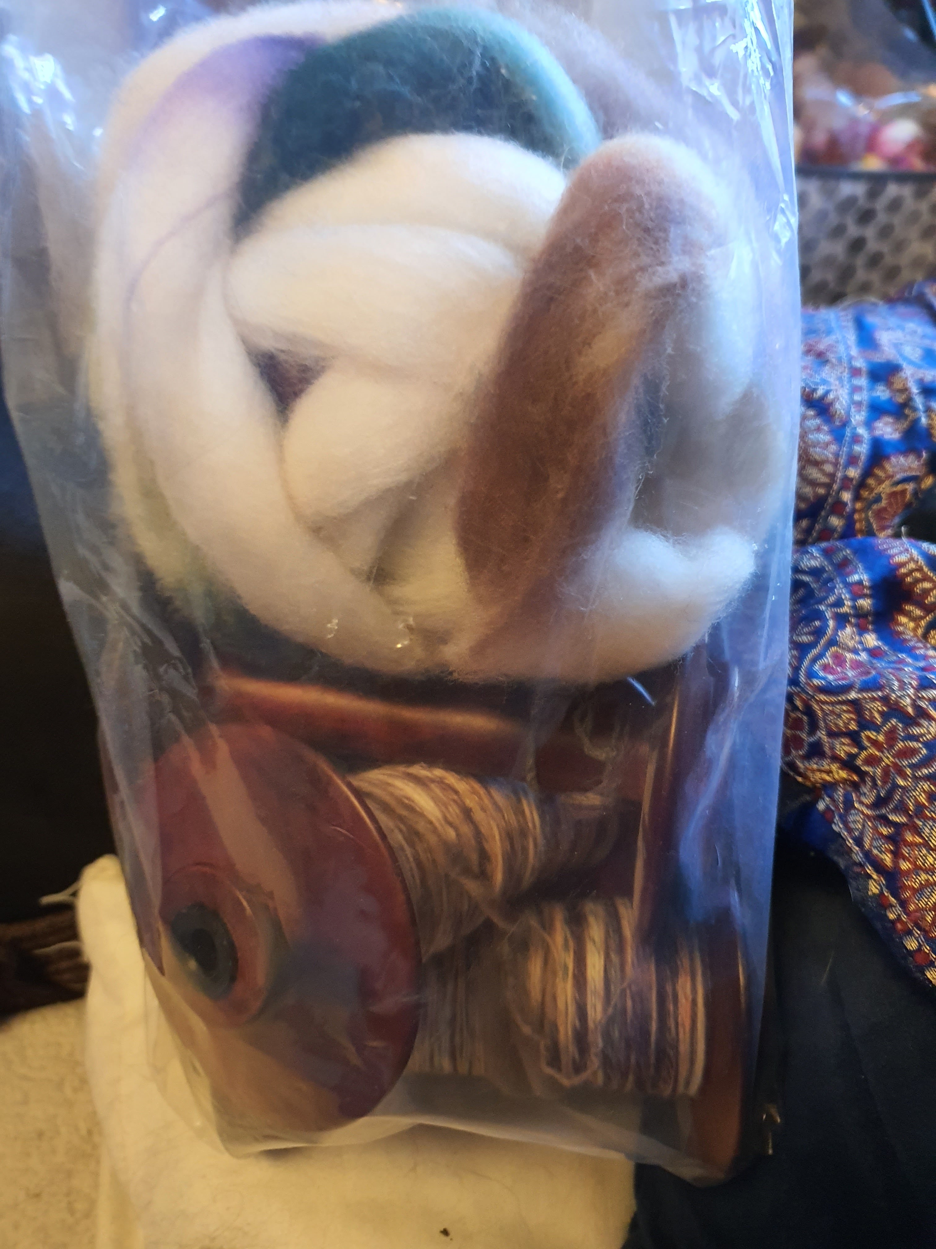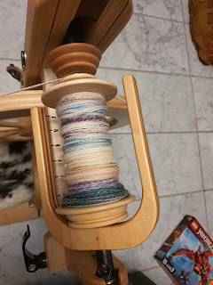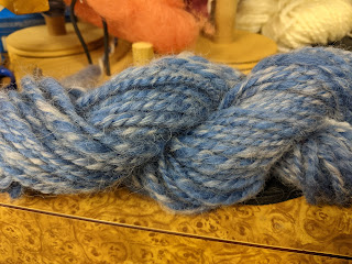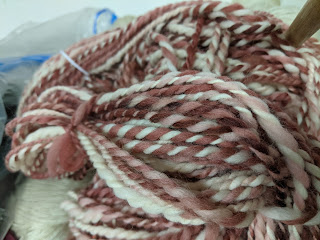 Finished objects. Previously, Michelle talked about how her daughter was weaving a rug. Her younger daughter also wants to weave one, but all we had left was white rug yarn. So we dyed it. It's red, fuschia and purple. Works in Progress: Michelle did some spinning. This was roving dyed back in her Washtenaw Wool dyeing days.