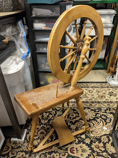 Finished objects. Previously, Michelle talked about how her daughter was weaving a rug. Her younger daughter also wants to weave one, but all we had left was white rug yarn. So we dyed it. It's red, fuschia and purple. Works in Progress: Michelle did some spinning. This was roving dyed back in her Washtenaw Wool dyeing days.
