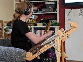 Michelle's daughter (Thing 1) asked to weave a rug, so Michelle taught her how to weave when she finished her rug. Thing 1 is now half way through weaving her rug. There should be enough warp on the loom for one more, which Thing 2 has asked to weave.